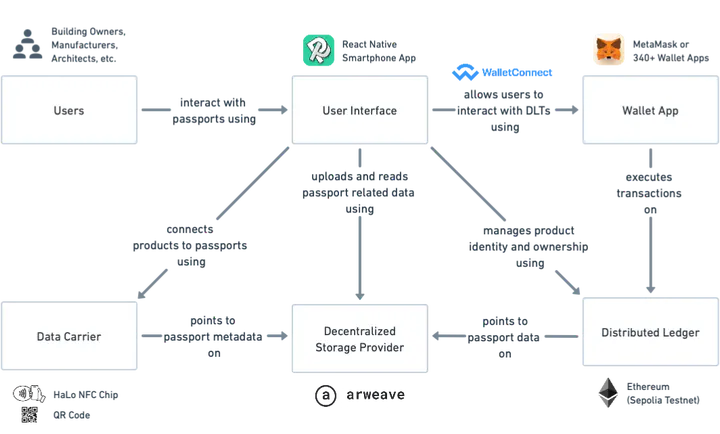 Purpose - Circular construction promotes the reuse of building components, yet a key challenge is to reliably link long-term information with physical products. This study aims to investigate how to implement a decentralized identifier system linking physical products to their digital data, and the design requirements necessary to evaluate these systems within circular construction. Design/methodology/approach - A pragmatist sequential multi-methods approach is applied, integrating technical prototyping, performance evaluation, and stakeholder validation. This study explores different identifiers (decentralized identifiers (DIDs) and tokens) and data carriers (QR codes and NFC chips). A mobile application prototype is developed and tested for operational efficiency, cost-effectiveness, and usability. Findings - QR codes outperform NFC chips in ease of use and efficiency, while DIDs offer higher interoperability compared to token-based identifiers. Blockchain technologies ensure long-term data integrity but introduce cost and complexity trade-offs. Stakeholder feedback highlights the importance of accessibility, user interface clarity, and legacy system interoperability for successful adoption. Research limitations/implications - This study is exploratory, with validation conducted in controlled environments rather than active deconstruction sites. Future work should test long-term performance in real-world reuse scenarios. Nonetheless, the findings have broad implications for research, practice, and society by guiding the development of robust traceability systems that enhance building component reuse and tracking for construction practices Originality/value - This research contributes to circular construction by systematically evaluating decentralized and physically backed identifiers for tracking building components. It provides empirical insights into various technological configurations and establishes a foundational design framework for digital product passports in circular supply chains.
